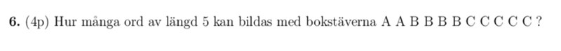 Såhär tänker jag: Vi ska räkna ut antalet ord av längd 5 som vi kan skapa med bokstäverna A, B, C.