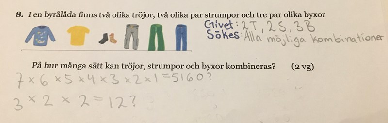 Hej pluggakuten! Jag har en fråga som jag har fastnat på, antal kombinationer med 7 klädesplagg. Jag har räknat med två räknesätt men den översta känns på något sätt för stort och den nedre för liten.. har jag tänkt rätt på någon av de?