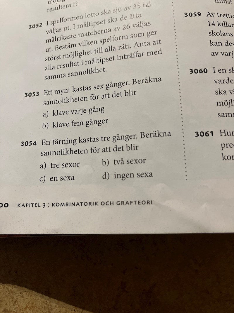 Hej jag behöver hjälp med 3054 b, för att ta reda på antalet kombinationer antar jag att ma n tar 3 över 2. För jag ska ha två sexor av tre tärningar. Då får jag 3 kombinationer. men det är detta jag inte förstår. Är inte kombinationerna