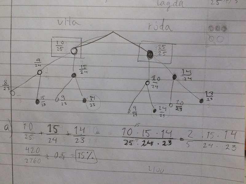 Okej, då är väl helt enkelt P(första röd)·P(andra vit)·P(tredje röd) = 15/25 · 10/24 · 14/23? Sedan multiplicerar jag dessa och får 2100/13800 = 15%
