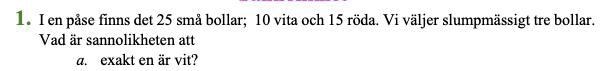 Därefter, jo, det går faktiskt! Det finns tre olika fall; endast kula ett är vit, endast kula två är vit, eller endast kula tre är vit. Sannolikheten för att kula ett är vit är . Sannolikheten att den första kulan är vit, är 10/25. Då blir sannolikheten för att den andra kulan är röd 15/24 (eftersom vi redan tagit upp en vit kula). Sannolikheten att den tredje kulan är röd är då 14/23, eftersom vi har fjorton röda kulor kvar, av totalt 23 st. Sannolikheten för att endast kula ett är vit är då produkten av dessa sannolikheter.