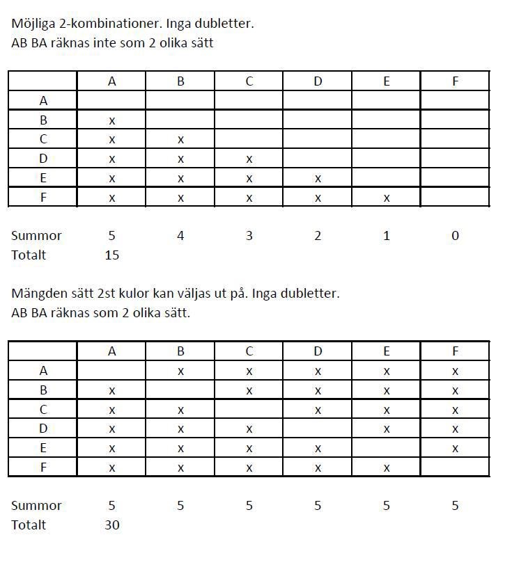 En glassförsäljare har sex samker att välja bland, vanilj, jordgubb, dajm, choklad, rom-russin och päron. Joakim köper en glass med två olika smaker. På hur många sätt kan man välja smaker?