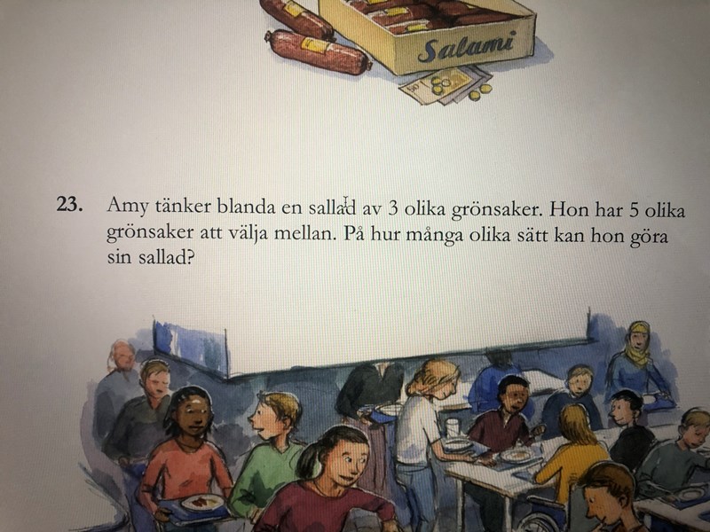 5*4*3 är rätt idé. Problemet är att den metoden är som att räkna "antal sätt att ställa tre av de fem grönsakerna i en kö". Det innebär att valen "tomat, gurka, paprika" och "paprika, gurka, tomat" räknas som olika. Men den här ordningen spelar ju ingen roll när du gör en sallad, grönsakerna ska bara blandas. Därför kommer 5*4*3 räkna samma grupp flera gånger mer än nödvändigt.