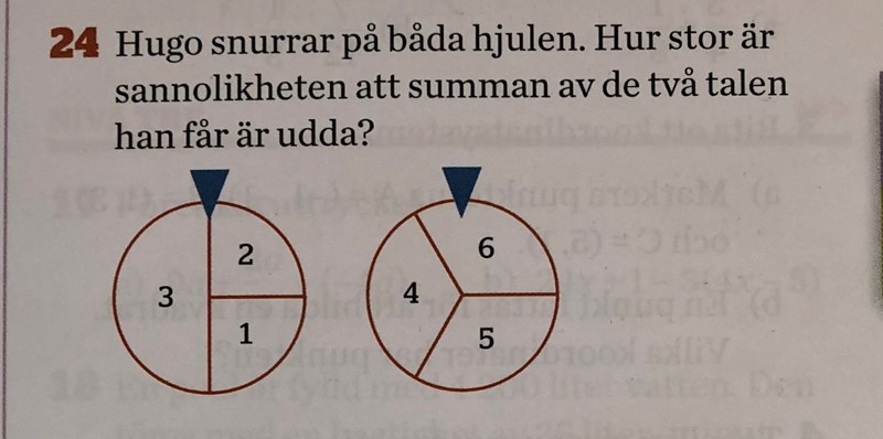 Men för att summan ska bli udda måste han väl få en jämn summa på ena hjulet och en udda summa på det andra?