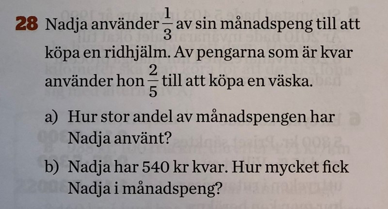 Då har hon 2/3 av sin månadspeng kvar. Av dessa pengar använder hon 2/5 till att köpa en ridhjälm