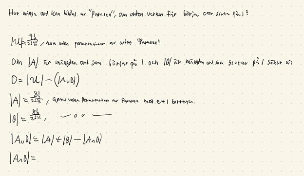 För om |A| är mängden av alla permuteringar som börjar (eller slutar) på l vill jag väl egentligen bara ta bort två |A| från universum?
