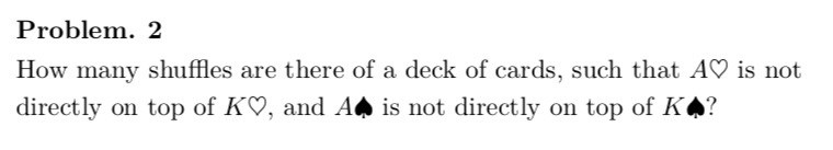 Jag använde mig utav inklusion och exklusions metoden där jag först tog fram på hur många sätt vi kan blanda en kortlek, det vill säga 52! och sedan räknade hur många gånger hjärter A är över hjärter K och såg dessa då som ett kort och använda multinomialen och fick sedan gjorde jag samma för då spader A är över spader K. Sen tog jag även fram de gånger som vi har räknat dubbelt enligt och får därav totalen till: