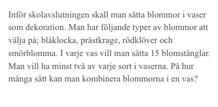 Smaragdalena skrev:Det är 15 blommor totalt, men 8 blommor är redan bestämda - två av varje sort. De sju sista kan vara vilken sort som helst. Jag skulle anvvända mig av stars-and-bars för att lösa uppgiften.