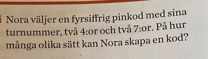 Hon kan sätta en sjua på fyra olika ställen, och den andra sjuan på tre ställen. De andra platserna blir 4. Men då har jag räknat varje variant 2 ggr - det spelar ju inte någon roll i vilken ordning jag väljer de båda sjuorna. Jag får det till 6 olika varianter: 7744, 7474, 7447, 4747, 4774, 4477. Kommer du på några mer?