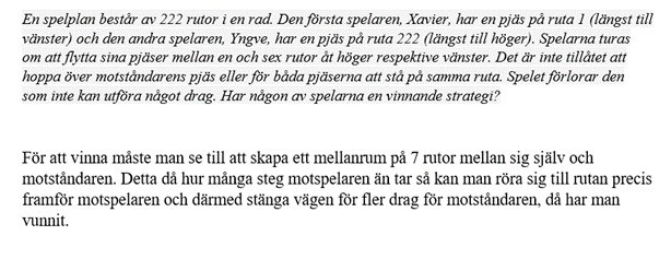 Smutstvätt skrev:När det gäller kombinatorik är det ofta hjälpsamt att reducera ned problemet till ett mindre problem först, så att det blir lättare att prova. Tänk dig ett bräde med sju rutor. Xavier börjar med att flytta sin pjäs. Hur bör Xavier göra? Finns det något drag som gör att Yngve kommer förlora?