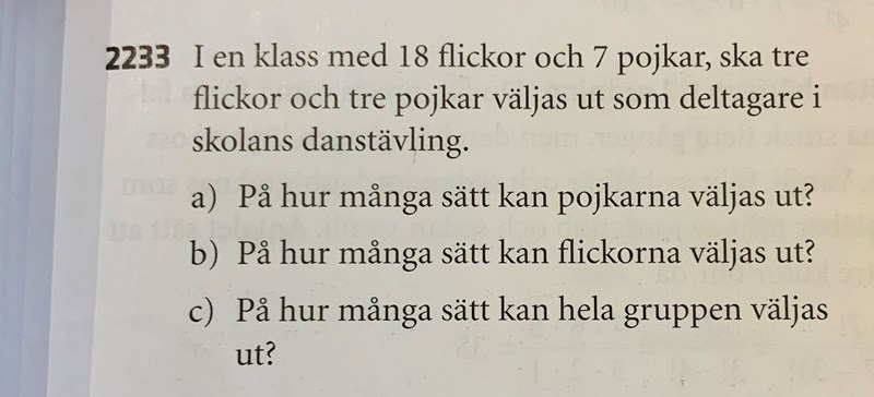 Hej! Jag ser svaret på upg a & b, men förstår ej varför jag ska multiplicera antalet kombinationer från a & b och inte exempelvis addera dem på fråga c