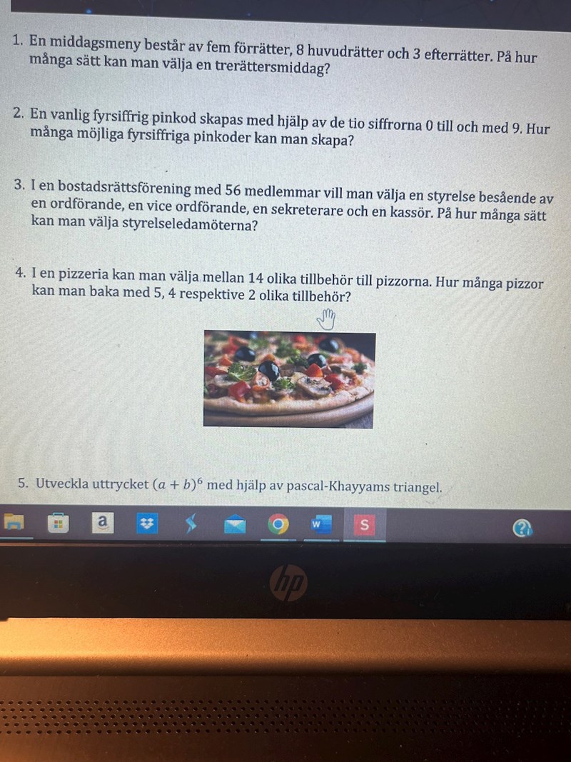 Löste den med hjälp av permutationer. 14^5 osv osv. Men hur tänker man egentligen när man löser denna uppgift. Utan att bara tänka på formeln och sätta in värden.