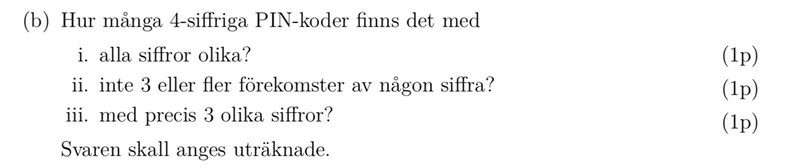 Jag tÀnkte pÄ frÄga iii. Du valde den första siffran pÄ 10 sÀtt, den andra pÄ 9 sÀtt och den tredje pÄ 8 (Ätta, inte med o!). Den fjÀrde siffran kan vara lika med nÄgon av de tre "upptagna" siffrorna, sÄ det finns 3 olika. Men om du vÀljer t ex siffrorna 1233, kan man ju ordna dem pÄ flera olika sÀtt, och det Àr vÀldigt lÀtt att gÄ vilse. 1233, 1323, 1332, 2133, 2313, 2331, 3123, 3132, 3213, 3231 om jag rÀknar rÀtt, alltsÄ 10 variant för varje kombination, men dÄ har jag ju rÀknat med alla varianter dÀr de tre olika sifffrorna Àr 123, 132, 213, 231, 312 eller 321.