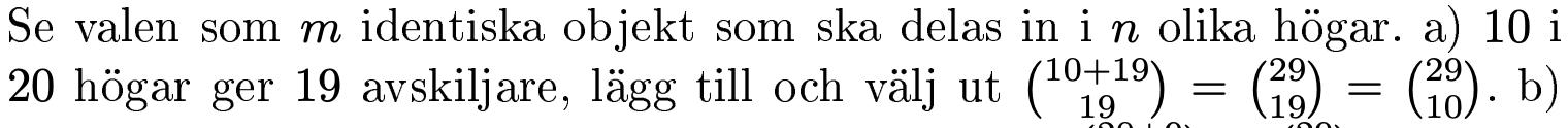 Denna uppgiften kan man behandla som ett fördelningsproblem, dvs att man kan lägga till avskiljare till mängden. Man kan även behandla objekten som identiska ty ordningen ej är väsentlig.