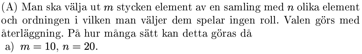 Du skall välja ut 10 föremål av 20 med återläggning. Detta kan göras på 2010 sätt, om man tar hänsyn till ordningen. Man kan ordna varje uppsättning av 10 föremål på 10! sätt. Det bör finns 2010/10! olika varianter.