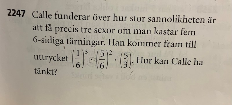 De tre tärningar som ska få en trea kan väljas på C(5, 3) sätt. Sedan är ju sannolikheten att alla tre får en sexa samtidigt . Men vi måste ju räkna med att de resterande två tärningarna inte ska få en sexa, dvs: .