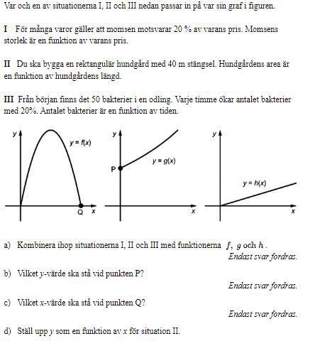 D) Rita figur. Rektangel med långsida x m. Vad blir kortsidan om omkretsen är 40 m? Skriv sedan ett uttryck för dess area.