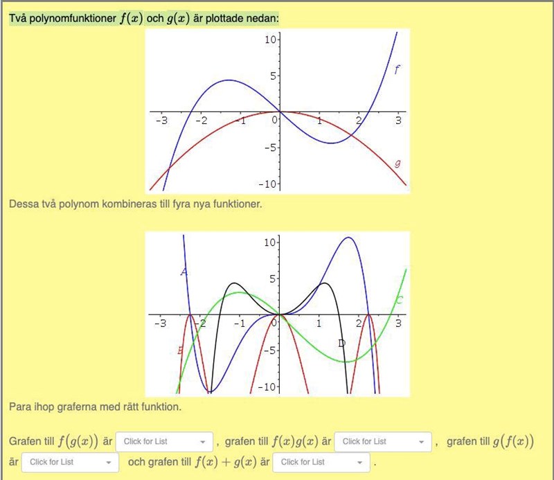 Jodå, det finns en sjättegradare bland svarsalternativen, men hela kurvan syns inte. En sjättegradare med negativ koefficient för sjättegradstermen ser i stort sett ut som ett upp-och-nervänt U (går mot negativa oändligheten för både stora positiva och stora negativa x-värden) och det gör den röda kurvan i den nedre bilden, men delar av kurvan är nedanför nederkanten