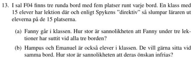 När jag programmerar uppgiften i Python får jag sannolikheten 2 / 7. Om jag väljer ett bord, och jag placerar Hampus och Emanuel i bordet kan detta göras på P(5,2) sätt och de tre resterande platserna kan väljas på 3! sätt, jag dividerar till sist med 5 eftersom jag arbetar med cirkulära permutationer. Eftersom det finns tre bord, så multiplicerar jag detta med 3 och får 72 sätt. Tänker jag rätt än så länge?