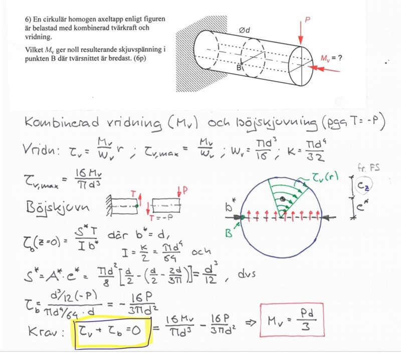 Man kan addera spänningar i alla punkter men måste då ta hänsyn till spänningarnas riktningar. I punkten B är båda spänningarna vertikala och kan därför adderas rakt av. Har man väl konstaterat det så inser man att de två spänningarna tar ut varann för att den totala skjuvspänningen ska vara noll i den punkten. Därav följer att tau_v + tau_b = 0.