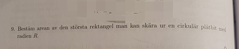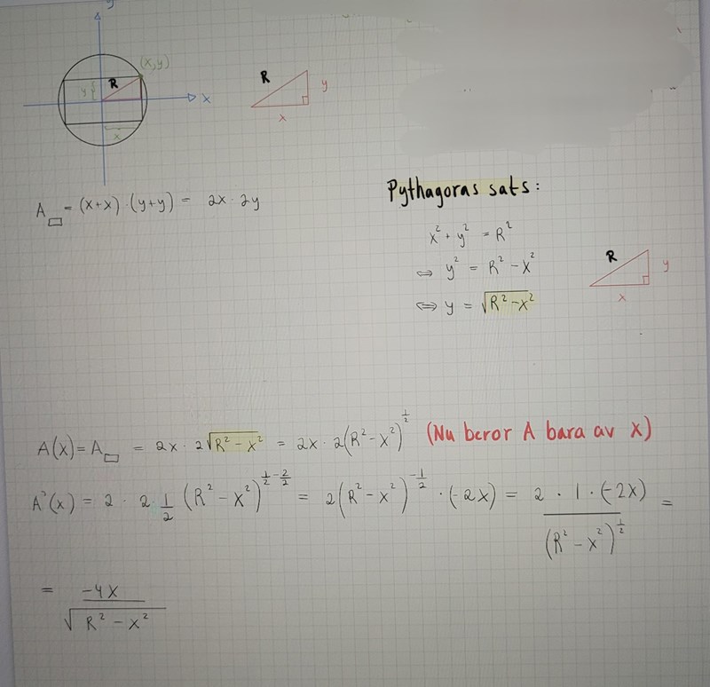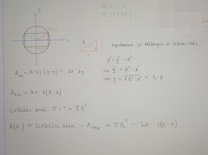 Här har jag försökt beskriva rektangelns största area genom att utnyttja Pythagoras sats för att ersätta y med ett uttryck med bara x. Sen fick jag ut min funktion. Verkar det rätt?