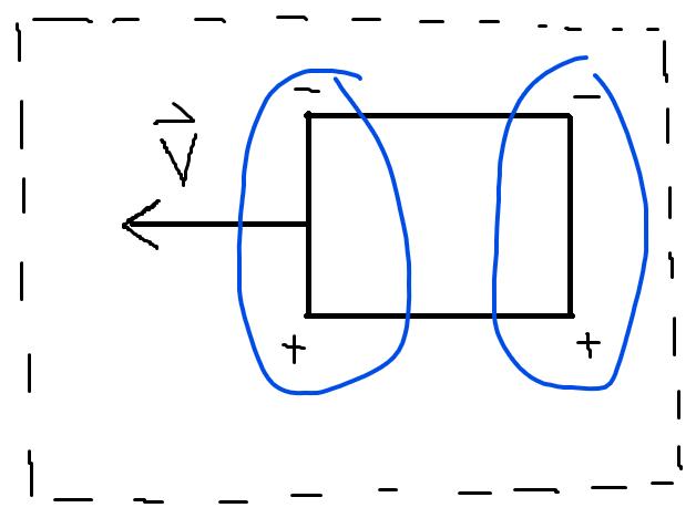 Här har vi en slinga av metall med försumbar resistans. Den rör sig åt vänster med någon fart i ett homogent magnetfält med någon styrka som pekar in i papprets plan. Då staven rör sig kommer det ske en uppdelning av elektroner i de två yttre vertikala delarna enligt . Kommer det börja gå någon ström i den här slingan? Hur kommer den gå då?