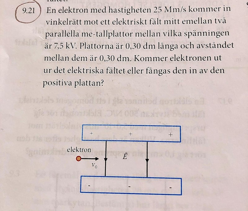 En elektron med hastigheten 25Mm/s kommer in vinkelrätt mot ett elektriskt fält mitt emellan två parallella metallplattor mellan vilka spänningen är 7,5 kV. Plattorna är 0,3 dm långa och avståndet mellan dem är 0,30 dm. Kommer elektronen ut ur det elektriska fältet eller fångas den in av den positiva plattan?