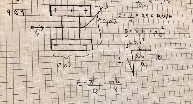 Elektronen fångas in av plattan. Under tiden elektronen förflyttar sig 0,15 dm mot fältets riktning hinner den 0,21 dm i sin ursprungliga färdriktning. Plattorna är dock 0,3 dm långa och därmed fångas elektronen av den positiva plattan.