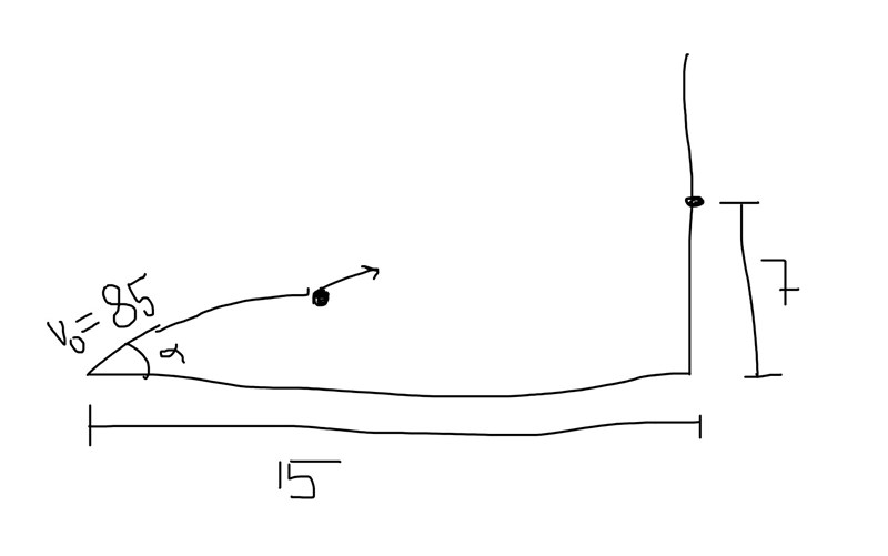 I ditt formelhäfte har du säkert en ekvation som lyder: . Kulan träffar husväggen efter att ha färdats 15 m i x-led, vi har att utgångshastigheten var 85 m/s och vi har att utgångsvinkeln var 25.017