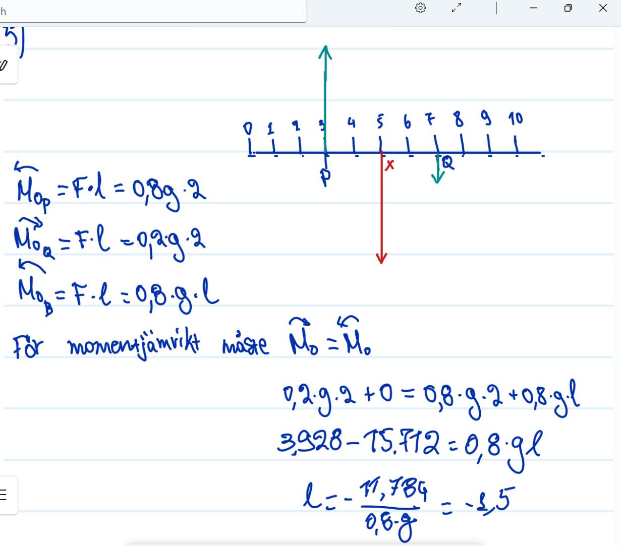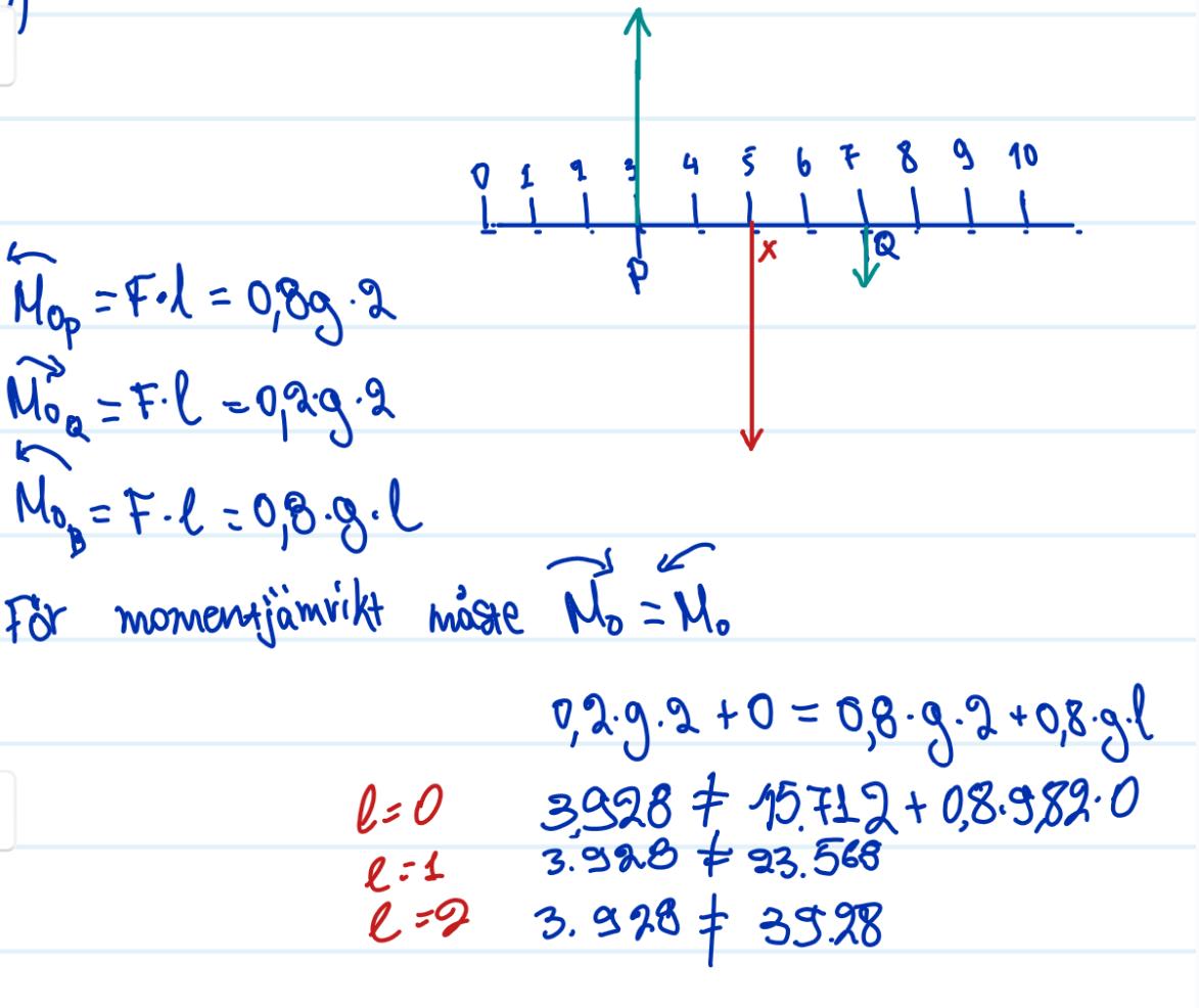 Förresten jag försökte ta olika fall för l och kommer inte fram till någon momentjämvikt. Har jag gjort något slarvfel i mina beräkningar?