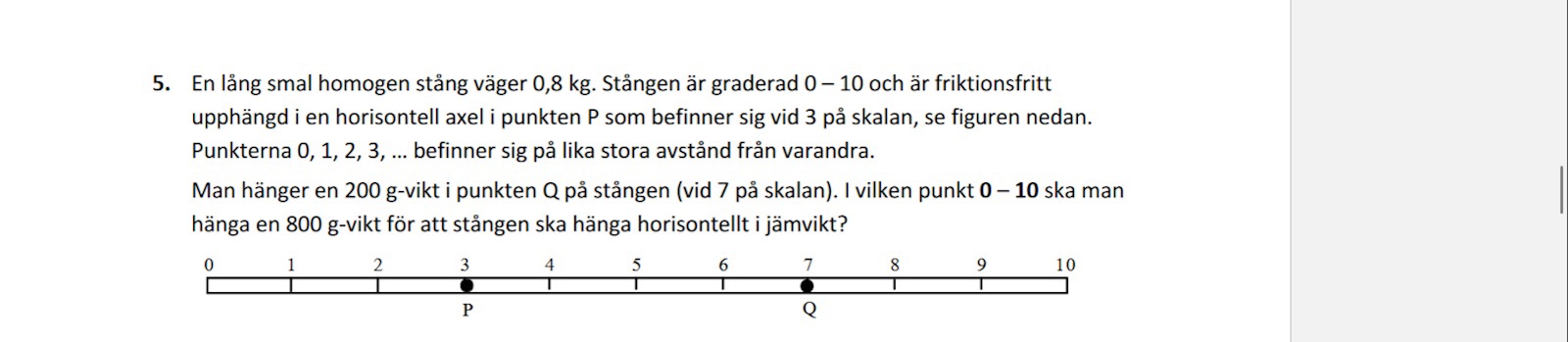 Alltså: rätt svar blir att 800-grams tyngden ska hängas på ett avstånd
