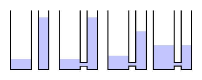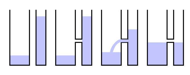 Låt oss jämföra denna utjämning med vad som skulle ske om de två kärlen förbinds med en gång som istället ligger i samma nivå som den slutliga vattennivån kommer att hamna vid. I det fallet så flödar vattnet synligt via en stråle tills dess att vattennivåerna utjämnat sig.