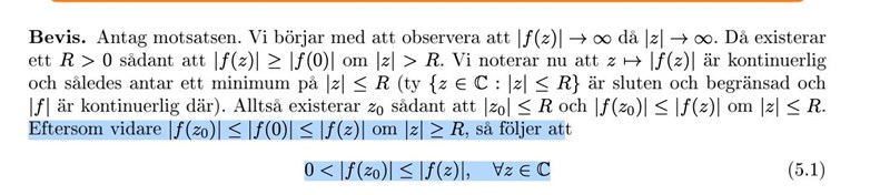 Är inte det urklippta resonemanget bara en omväg? Beviset börjar med att anta satsens motsats, dvs. att f(z) inte har något nollställe. Men det är väl direkt ekvivalent med att |f(z)| > 0 för alla z, eller missförstår jag något? Hur fortsätter beviset sen?