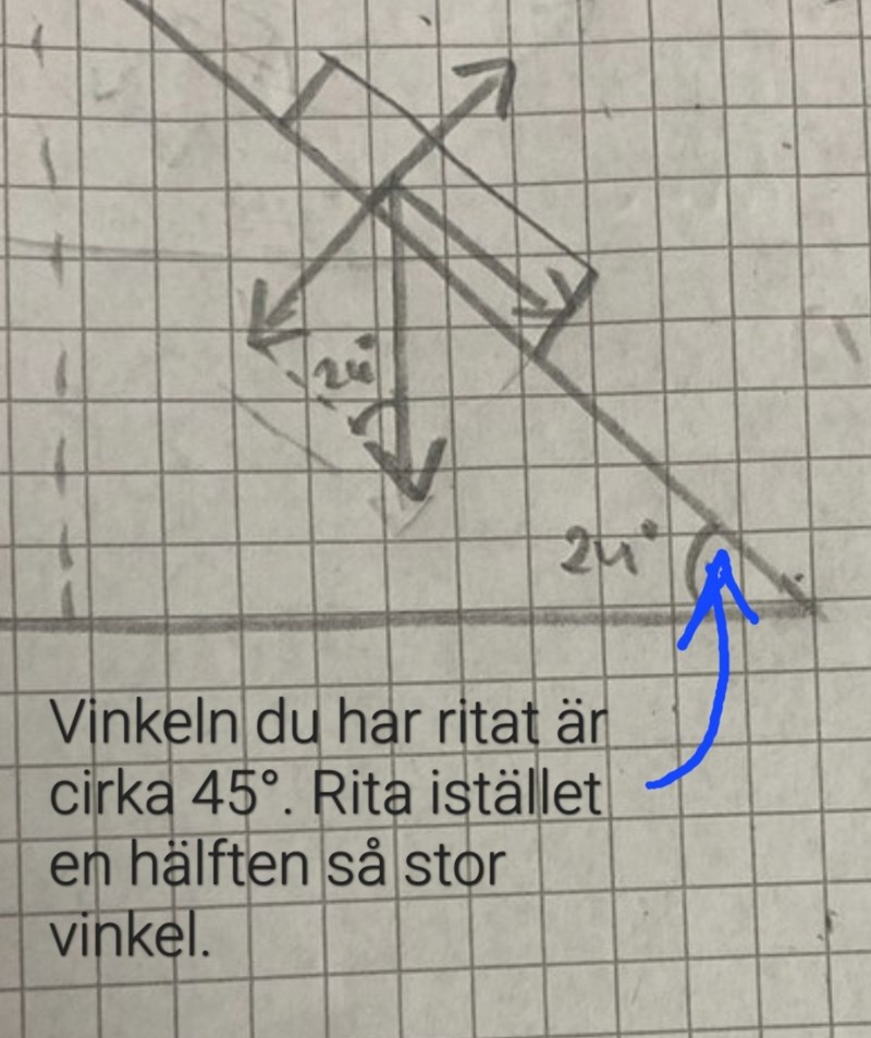 Nu ritar du vinkeln 24° som om den vore 45° igen. Då är det, precis som Pieter Kuiper skrev, svårt att se vilken av de andra vinklarna som är 24°.