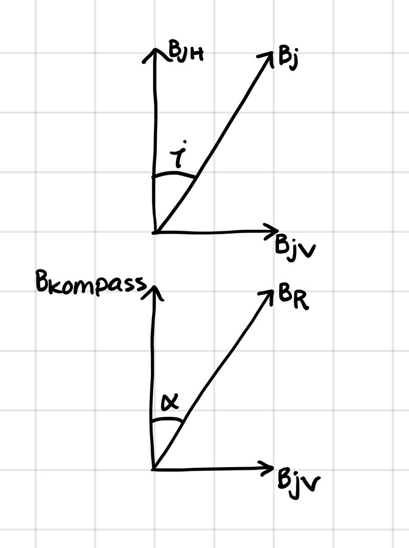 "Ett flygplan flyger längs en nordsydlig likströmsledning. I ledningen går en ström i riktning norrut med 115 A. Planets kompass befinner sig 12 meter rakt över ledningen. På platsen med ledningen har det jordmagnetiska fältet värdet 52 μT med inklinationen 68°. Bestäm kompassens avvikelse från norr."