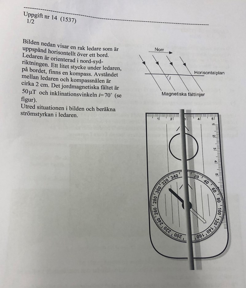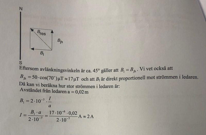 Om det inte hade varit någon ström i ledaren, skulle kompassen ha pekat rakt norrut. Att avlänkningsvinkeln är 45o betyder att kompassnålen pekar antiongen år nordväst eller nordost.