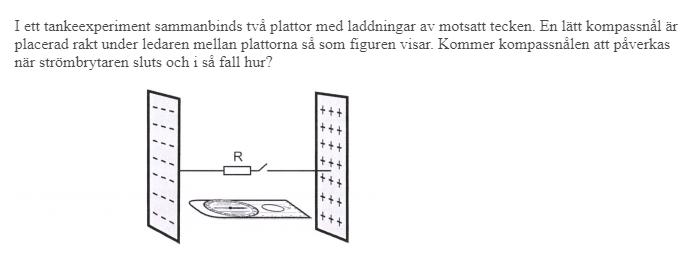 När strömbrytaren sluts kommer en ström att ta sig fr. plus t. minus alltså till vänster. Mha högerhands regeln vet vi att det elektriska fältet rör sig moturs kring ledaren. Kompassnålen kommer påverkas av detta och ge flytta sig en bit till vänster och sedan tillbaka till ursprungs positionen. (Moturs)