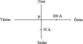 "1,5 m rakt ovanför en orienterares kompass korsar två isolerade likströmsledningar varandra. I den ena ledningen går strömmen 300 A mot väster. I den andra går strömmen 50 A mot norr. Jordmagnetiska fältet har flödestätheten 80 µT och inklinationen är 60°.I vilken riktning pekar kompassnålen? (Orienteraren befinner sig på norra halvklotet.)"