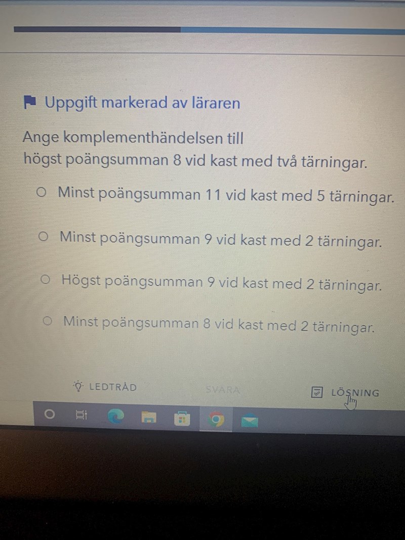 Snälla någon hjälp mig med denna. Jag fattar inte. Konplmenthändelse är ju P(inte få 8)-(få poängsumman 8) men jag vet inte hur jag ska göra här.
