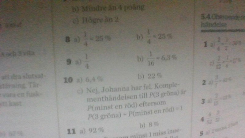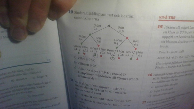 p(3 gröna) = 0.4^3 = 6.4% (det är samma sak som 0.4x0.4x0.4)