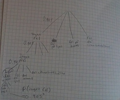 om jag ritar ett täddiagram för detta kommer den ha fyra nivåer/våningar. För varje våning kommer sannolikheten för inga fel vara = 0.905