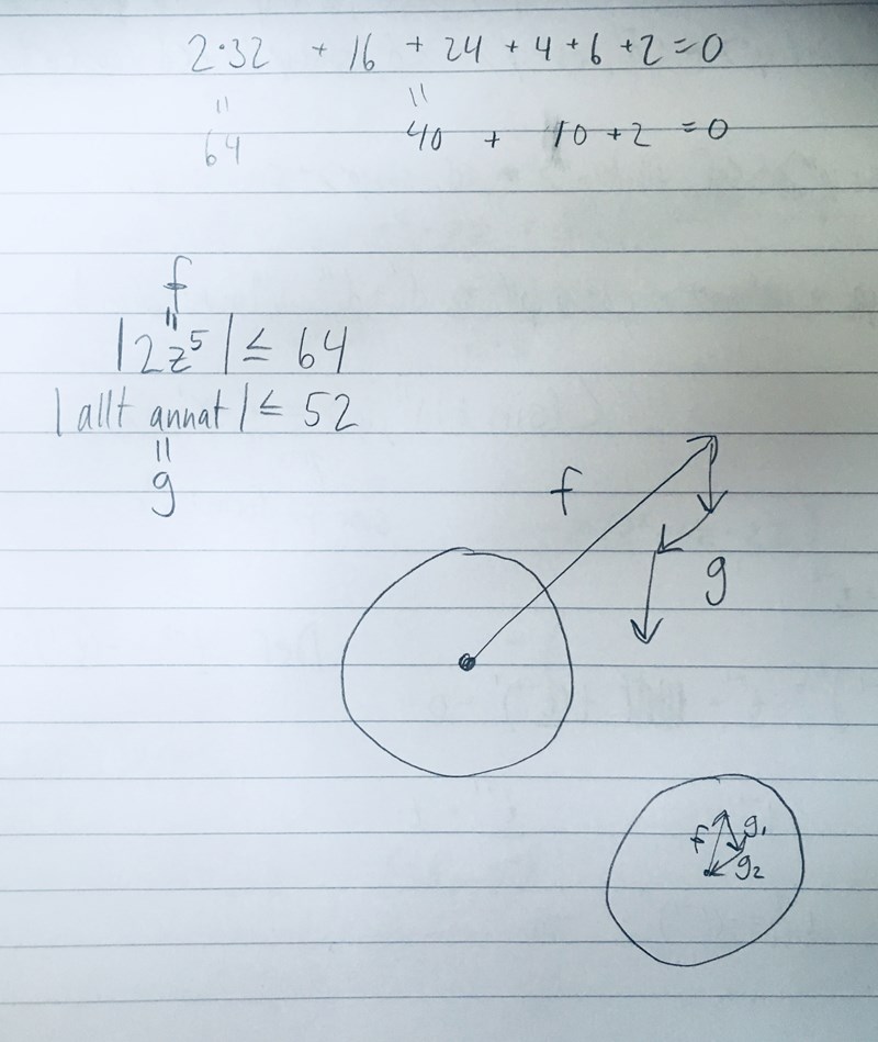 3. Du har en 5-gradare, och ska ha 5 lösningar. Din valda bit har alla 5 lösningar innanför ringen (x1-x5=0), så då måste hela funktionen ha lika många innanför. (För resten är för kort för att ställa till det typ, finns säkert ngn mer matematisk förklaring, men jag kan den inte..)