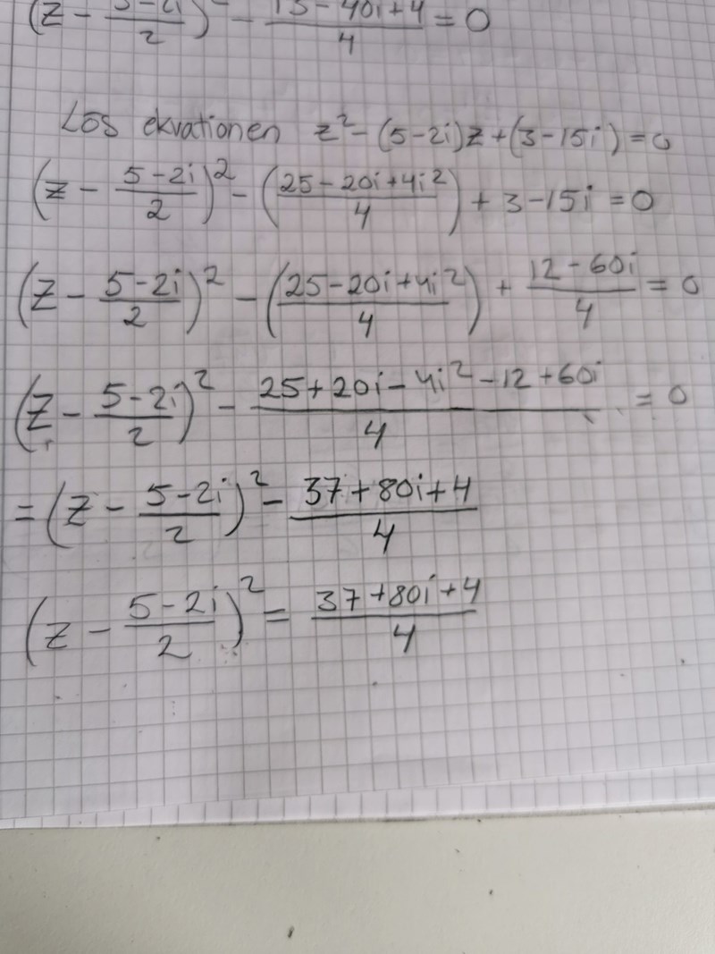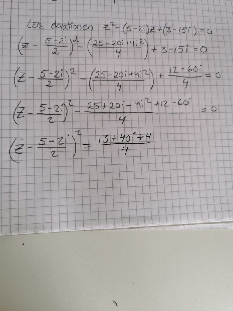 Det ser bra ut till och med tredje raden, men sedan blir det fel. Omdu skall sätta in 12-60i inuti parentesen, så måste du byta tecken (det är ju ett minustecken utanför parentesen). Alternativt kan du multiplicera 12+20i-4i2 = 12+20i+4 = 16+20i med -1 innan du fortsätter, det är en smaksak vilket du föredrar.