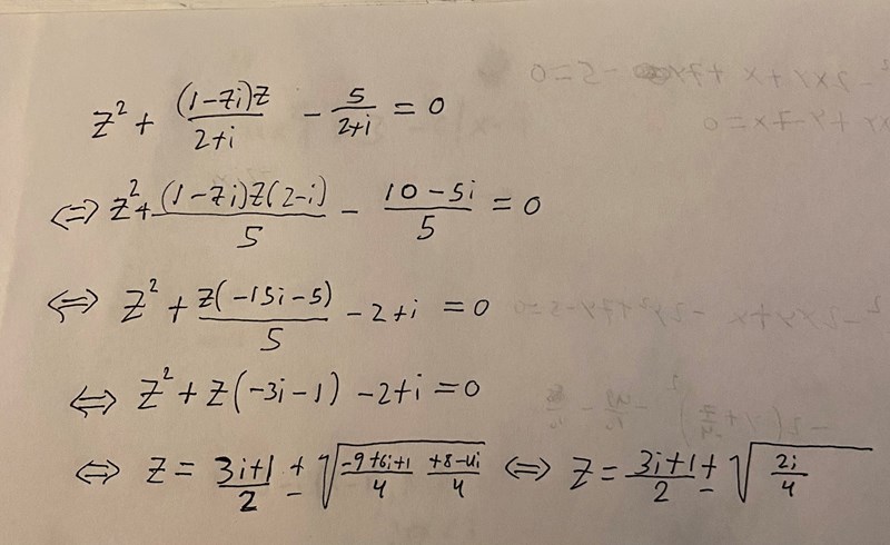 börja med att dela ekvationen med 2+i, förläng med konjugatet i de två termerna som harf nämnare och förenkla, sen sätter du in atacken med pq