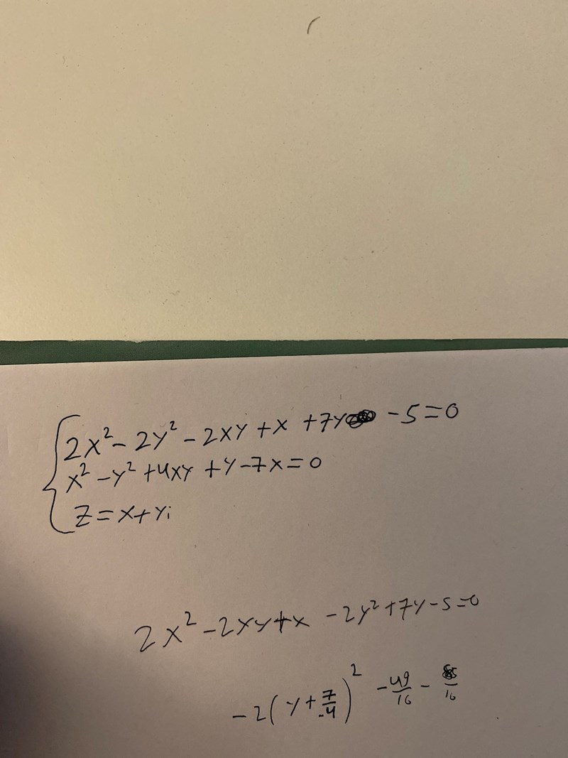 har försökt lösa denna genom att sätta z=x+yi. Därefter kom jag fram till följande ekvationssystem men det känns besvärligt att lösa.