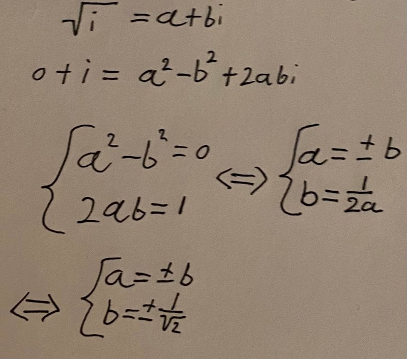Om man räknar komplext kan man dra roten ur alla tal, alltså även i. När man behöver dra roten ut komplexa tal är det enklare att räkna med polära koordinater, så som du lärde dig i Ma4. Mer specifikt behöver du de Moivres formel, som bl a säger att för att få fram (kvadrat)roten för ett tal i komplex form skall man beräkna roten ur absolutbeloppet och halvera argumentet (om man vill ha sitt svar på formen a+bi är dtta lite bökigt). Om du inte har lust att räkna på det sättet kan du istället kalla roten för a+bi och lösa ekvationen (a+bi)2 = i genom att se till att både realdel och imaginärdel är lika för VL och HL.