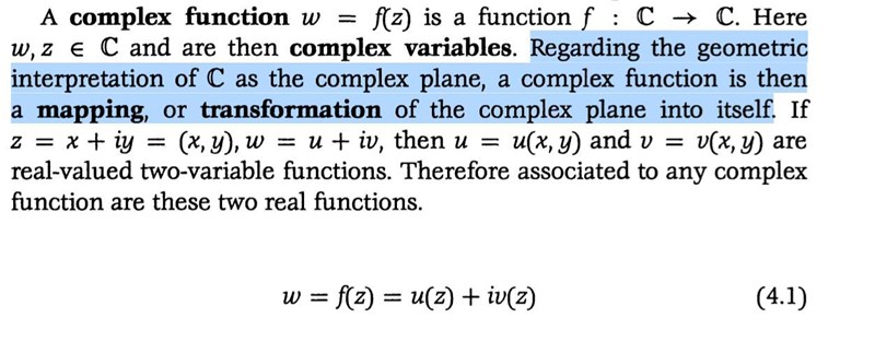 Och om man spinner vidare på det spåret och ska förstå vad en komplex funktion är, då är det något som tar det komplexa talplanet och förvränger det på nåt sätt. Sträcker ut, roterar, speglar, böjer osv, så att punkter hoppar från en plats till en annan enligt någon regel (funktionen). En bild ur boken "Visual Complex Analysis" kanske förtydligar: