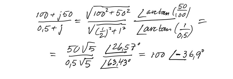 detta är första exemplet min bok ger på komplex impendans men jag förstår inte hur omvanligen i den sista raden gick till. Hur blev 100+j50=50*sqrt5 vinkel 26,6 och hur omvandlades nämnaren? Hur blev den slutliga vinkeln -37,2 grader?