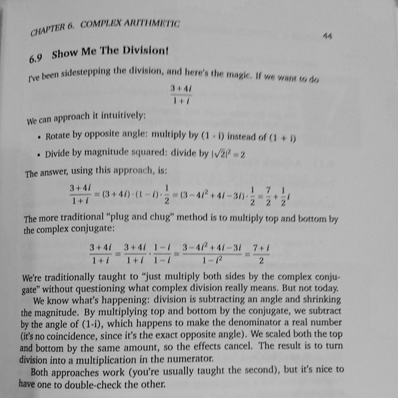 Nu läser jag lite Better Explained, och jag vet inte riktigt om min problem är med engelska eller matte, jag bara kan inte riktigt fatta vad han menar med en komplex tal division är att rotera med den motsats vinkel och dividera med magnituden.