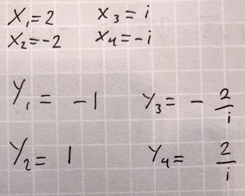 Räkna ut dina 4 motsvarande y och sedan har du dina 4 lösningar på formen z=x+yi